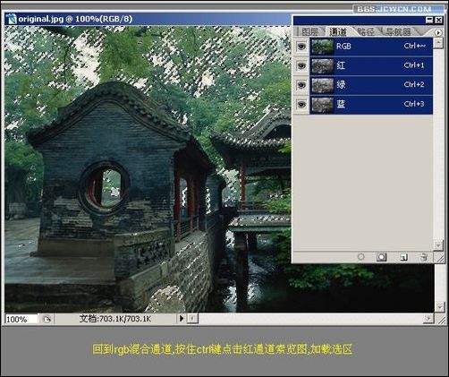 三、回到RGB混合通道,按住Ctrl键点击红通道索览图,加载选区