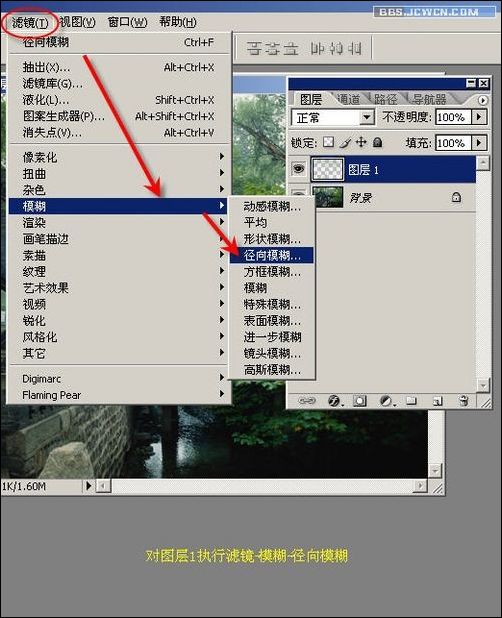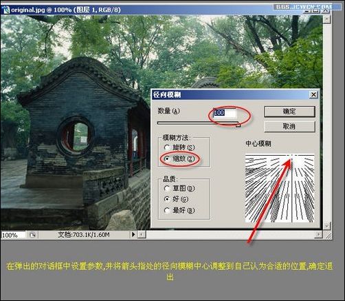 六、在弹出的对话框中设置参数,并将箭头指处的径向模糊中心调整到自己认为合适的位置,确定退出