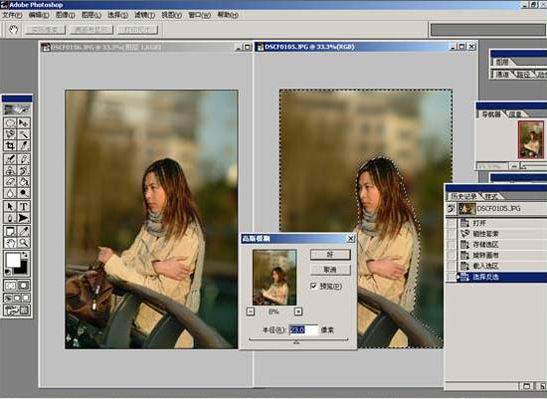 选取完毕后用羽化滤镜稍微对边缘进行一下几个象素的羽化,使得其边缘过渡变得平滑。羽化完毕后将所选部分复制到那张“对焦不准”的照片中与其中模糊的人影重叠后一张真实景深的照片就这样由你的数码相机拍摄出来了,十分的简单吧。