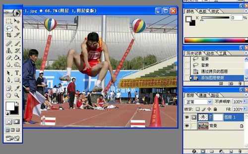 3、 为了便于观察操作效果,先用鼠标在背景层前的眼睛图标上单击,将背景层关闭。在工具箱中选毛笔工具,前景色设定为黑色。在选项栏中选定合适的笔刷直径,不透明度为100%。用毛笔精心地将人物周围多余的部位遮挡掉。【编者注:这三步的目的就是创建一个只包含需要保留清晰的部分——运动员——的新层,不一定按照上述步骤操作,例如,可以先仔细创建选区,然后按Ctrl-C、Ctrl-V,或者先复制新层,再把不需要保留的部分擦除……只要达到这个目的即可】。