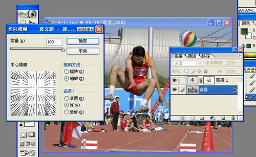 爆炸效果是在拍摄像片的时候,使用较慢的快门速度,同时迅速改变镜头焦距而产生的特殊效果,这种效果的相片给人以强烈的视觉冲击感,使拍摄体育比赛中常见的表现手法。但是拍摄这种效果的照片需要很高的拍摄技术和较好的相机,直接用普通的数码相机时排不出来的。为了强化相片的表现力,可以在后期处理中实现模拟变焦镜头爆炸效果。