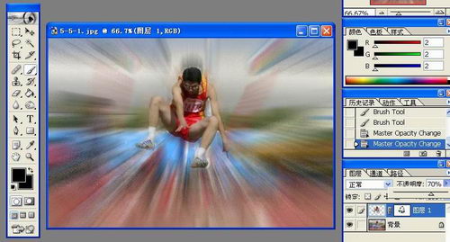 5、 现在可以看到爆炸的初步效果。但是人物的边缘太清楚了,还需要作进一步修饰。用鼠标在图层面版上单击上边图层的蒙版图标,进入人物图层的蒙版编辑状态。降低不透明度到70%左右 【编者注:这是模拟爆炸效果的关键,但常言道“过犹不及”,处理效果也应该适可而止,背景模糊适当,有爆炸的效果即可】。