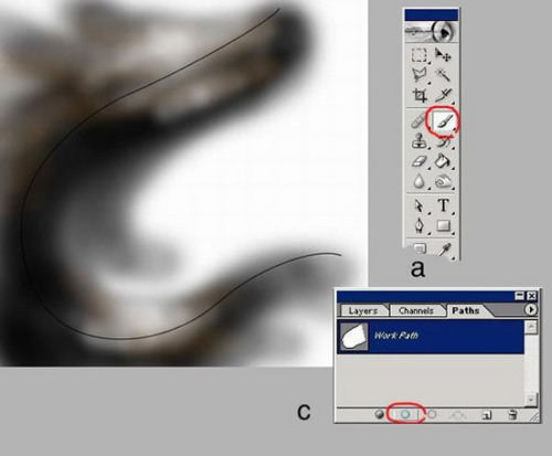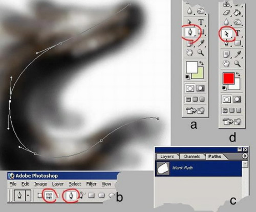 4. 接下来要动真格的了。选用Pen Tool(图a),在那团稀奇古怪的东西上拉一条流畅线条,流畅是关键,否则MM会有借口为此抱回各种进口洗发液,至你的血汗钱于乌有。别忘了拉线条前选择上方工具属性控制板里的Paths(图b),省得吓自己一跳。这条线代表MM的一根头发,在PhotoShop术语里叫做路径。现在可以干一杯了,因为你从此可以告诉别人,你精通路径技术。不信你可以点开Paths面板(图c),瞧瞧这千真万确是你原创的路径。如果你不满意这根头发,可以选择Direct Selection Tool(图d),调整线条直到完美。