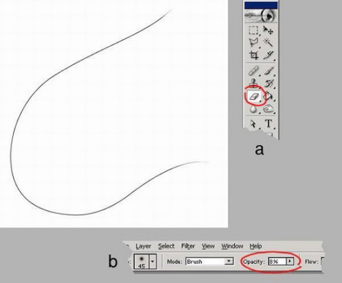 6. 为了以免再有**人骂我骗子,可以暂且将画了丑头发胚子的图层关了,我知道很多人一直对它不满,而且忍了很久了。拿起橡皮擦Eraser Tool(图a),小心把头发两端处理一下,所谓小心,就是指将Opacity值调低一点(图b),否则你的橡皮擦将比剪刀更生猛。