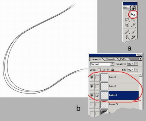 7. 下面的一系列工作你必须忍着点,因为你基本上将等同于一瓶生发液。选择Move Tool(图a),按着Alt键去拽那根头发,这就是著名的图层快速拷贝。拽一下数一下,直到你数得腻味为止。你不要告诉我你拽了97根之后,就再也拽不动了!这可没办法解决,或者你可以投诉Adobe公司坏了你MM的头发??PS默认支持层数就只有99层!不过我插一句,你可别开这种玩笑,我只是随便那么一说,你就真的去玩命地拽啊?这样吧,如果你答应常顶我的贴子,我就告诉你不用拽90多下的方法。OK,就这么说定了。实际上聪明人比如像我一般只拷贝两次,这样就会有三根头发,这样一幅《三毛之发》的作品就已经完成了。好了,不开玩笑了,还是回到三毛上。你可以发现每根头发实际上都是独立的一层(图b),这真是件好事,这样你就可以任意移动其中一根,使三毛总体上稍微具有一点自然美感。