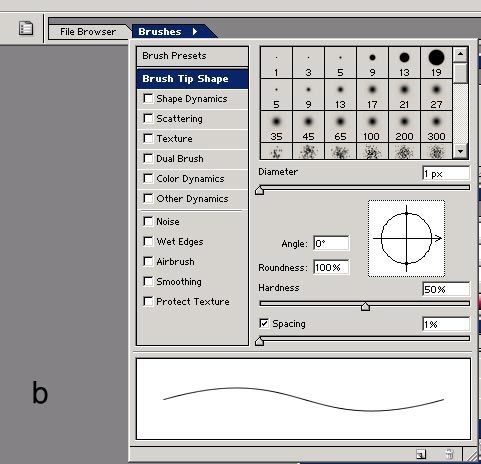 5. 真正的头发要出现了。选择Brush Tool(图a),打开笔尖编辑面板(图b),懒得跟你多说,照我说的做(图c)。制作好了笔尖之后,把前景颜色选为黑色,Layer面板里建一个新层,建议取个名字,你知我知就行,否则将来你麻烦大了。确定当前工作层为新建层,然后再进入Paths面板,你的原创路径居然还在,看来它已经跟定你了。手起鼠落,直点面板下方Storke Paths with Brush(图d)。OK,头发来也。什么,我是骗子?老兄做人不能这样,看不清楚,那是因为你没有按一下Ctrl-H把路径从画面上隐藏,这不能怪我啊。