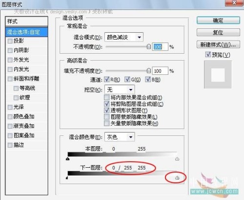 打开混合选项,在混合颜色带的第二条渐变框下边有四个小三角,左边两个右边两个,按住ALT将左边的小三角往右边拖动,数值为0/225 255,点击确定;