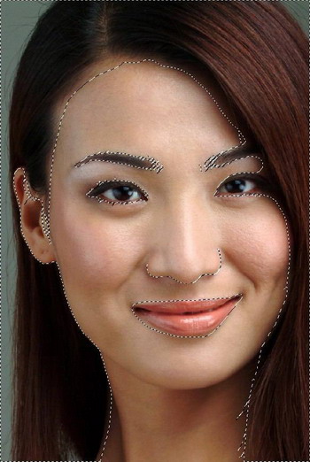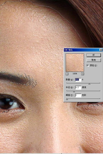 7. 关键部分 在底层上用快速蒙版选区,选择皮肤部分,用滤镜 USM锐化 ,加强皮肤毛孔影象