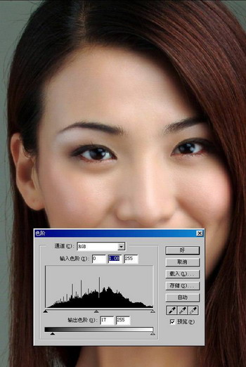 9.调整被柔化皮肤层的,不透明度为80-90%,显露下层毛孔,同时调整 色阶 减小皮肤层的色差和反差,合并所有图层。