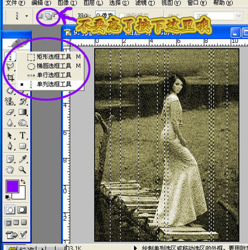 6.选择单列选框工具,在图层1上随意的选出几条直线,然后白色描边1像素。