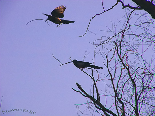 (二)选择好要拍摄的地点树,水面等。我喜欢拍摄树上的鸟,以此为例。尽量接近目标将相机的焦点对准树上落着的鸟儿,按快门半挡向您预测鸟儿可能要飞过的空域移动画面。请一助手在相反的方向将鸟儿惊之。助手和您按快门的时机要配合好,因为这种题材大部分要使用长焦,视角已经很小了。如果在野外没有助手的情况您要使用角架选好画面耐心等待了,一般鸟儿在起飞前是有预备动作的,看准时机按快门。