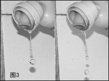 与光圈优先相反,快门优先是在手动定义快门的情况下通过相机测光而获取光圈值。快门优先多用于拍摄运动的物体上,特别是在体育运动拍摄中最常用。很多朋友在拍摄运动物体时发现,往往拍摄出来的主体是模糊的,这多半就是因为快门的速度不够快。在这种情况下你可以使用快门优先模式,大概确定一个快门值,然后进行拍摄。并且物体的运行一般都是有规律的,那么快门的数值也可以大概估计,例如拍摄行人,快门速度只需要1/125秒就差不多了,而拍摄下落的水滴则需要1/1000秒。为了让大家看到不同光圈下的效果,拍摄了以下水滴的画面(如图3),左右两边画面的曝光量相同,只是所用的快门不一样。