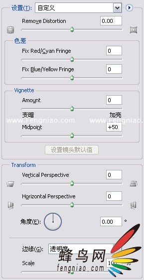 接下来,我们来调整广角镜头带来的桶状变形和四周黑晕。对于桶状变形,我们只须拖动第一条滑块(去除变形Remove Distortion)向右。