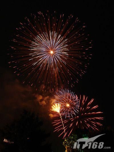 如果是观看烟花表演的话,那么通常观众都会非常多,那么首先就得选择一个能够很好地安放三脚架的位置,然后再开始对相机进行设定了。首先,一台能够使用慢速快门的数码相机是必须的了。拍摄礼花最合适的快门速度在2秒左右。快门速度再慢的话,也不会有太大的作用,而如果快门速度太快了,则只能拍到礼花火焰零零散散的画面了。如果照相机本身有“礼花模式”的话,那么就简单许多了,如果没有的话,就需要自己手动设置快门速度。