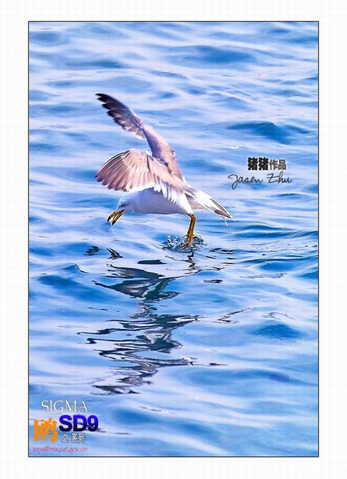 海鸥的双脚在水面上一点,能够看到海鸥口中捕获一条小小鱼,快门:1/500s 、曝光:F4.5、 ISO 100、 焦距:270mm 、自动白平衡,自动对焦、镜头:SIGMA70-200/2.8,海边手持。