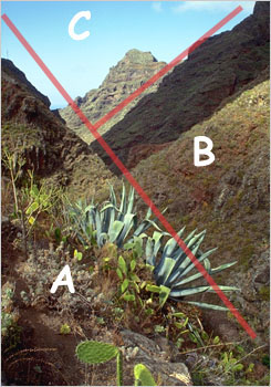 有时在我们看到的场景中有一个引人注目的被摄主体,但往往由于主体周围杂乱的环境分散了观众的注意力而削弱了主体的吸引力,使照片最终的效果令人很失望。试试寻找一个能够排除杂乱环境干扰的天然画框使观众注意力集中于被摄主体,如图D利用主体周围的树枝形成一个天然画框从而使中间的山岩更为突出。