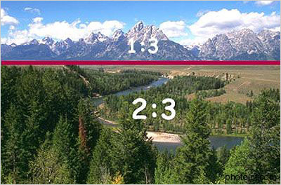 “三分法则”实际上仅仅是“黄金分割”的简化版,其基本目的就是避免对称式构图,对称式构图通常把被摄物置于画面中央,这往往令人生厌。在图C1和C2中,可以看到与“黄金分割”相关的有四个点,用“十”字线标示。用“三分法则”来避免对称在使用中有两种基本方法,第一种:我们可以把画面划分成分别占1/3和2/3面积的两个区域。