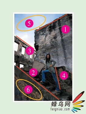 在<照片2-10>中,利用广角镜头以框取全景的方法拍摄了人和背景。在以人物为中心红线标记的①、②、③、④ 上展现画面的动感和运动效果。其中,①、②、③ 保持三角形态,④ 以不稳定的线条形成动势,表现紧迫感、活动感。椭圆标记的⑤、⑥ 强调的是面,缓和人物周围复杂的线条,增加柔和感。另外,空白的留取在废墟的惨淡中增添了稳定因素。