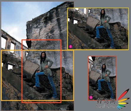 取景① 的构图并不复杂,复杂的是“废墟”这个空间,该空间存在较多的线和面,这样影响观赏者的注意力,视线不能集中到人物上。取景② 以人物为中心截去环境,表现暗、浊的色感,沉闷的视觉感。分别以横向和纵向构图,满满框取的人物照片①、②,都表现出沉闷感。这表示,对于人物照片,不是盲目地大比例框取人物,全景拍摄的关键在于背景和人物的协调性,即利用背景强调人物,并赋予表现力。这是全景拍摄的基本原则。