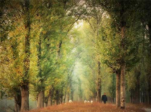 机会终于再次来临,一天的日落时分,再次从那里经过,昏黄的散射光下,身着深色衣服的牧羊人和洁白的羊群,在树林中构成一幅迷人的画卷,于是便抓紧时间拍摄。由于当时光线很弱,使用了三角架,光圈F3.5,快门时间1/20秒,后期调整饱和度、柔化和暗角处理,完成了《秋牧》的创作。