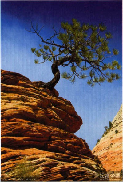 (b)最大限度地强调树上面的天空(如同上图,我更多的是突出树底下的岩石。但我拍摄时这两种方法都用了——有些是树上面蔚蓝的天空,降低树在景框的高度,有些像此图一样,让树靠近顶端,让很多岩石在树下。我强调的是岩石,因为我觉得它比蔚蓝无云的天空更有趣)。