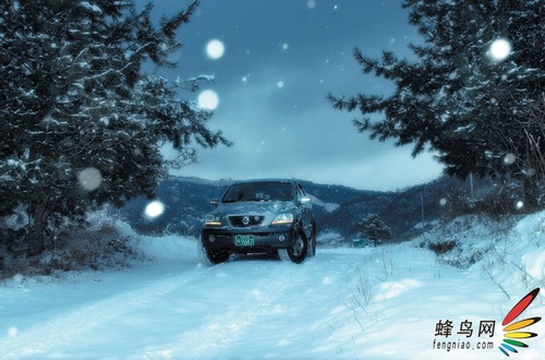 照片3-53富有柔和感的雪景 <照片3-53>的摄影背景是树林。在车辆的左右对称布置了树木,加大画面下侧的比重,强调了雪地里艰难行驶的车辆。该照片中,车辆位于画面的中心,但是没有产生主被摄物的感觉。雪花和占据大部分画面的雪,使画面融合后形成了一幅风景画。为了调节冰凉的感觉,开启了汽车的前照灯。雪具有表现截然不同的冰凉感和温暖感的双面特性。