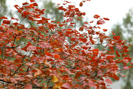 黄栌,杜甫《琵琶行》中有“黄栌苦竹绕宅生”的诗句描写居住环境的恶劣,实际上北京西山红叶的主要树种就是黄栌,“香山红叶”是北京的自然景观之一,山上的主要树木就是黄栌。此外在我国南方地区常见的三角枫、漆树以及一些不知名的小灌木都有秋季变色现象,也是很好的拍摄素材。