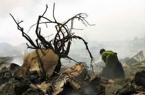 高高指向天空的树根和遍地狼籍使海啸带来的破坏被有效地强化;弯身寻找着什么的那个人,十分精炼地代表着人类,承受着的灾难带来的后果。作者只用了这两组主要形象,就十分精彩地完成了这一主题的描述。欣赏者也一定会通过这两组形象,充分地感受到海啸的残酷——这两组形象就象一个桥梁,顺利地完成了从拍摄者到观察者的信息沟通目的。