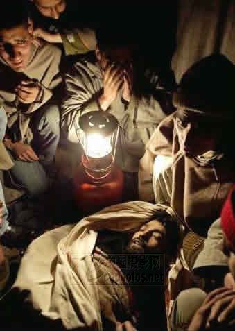 这是路透社记者Fayaz Kabli 今年1月份拍摄自印度克什米尔的一幅照片。一个人在枪战中死去,他的家属正在哀悼。死者平静的脸和亲人悲痛、无助的表情,只用一只马灯便十分生动地勾划了出来。作者用一种近乎油画的拍摄效果,使画面流露出浓厚的宗教气氛,从而更深一层地交待出亲人生离死别的悲剧情节,揭示着战争给人类带来的灾难。