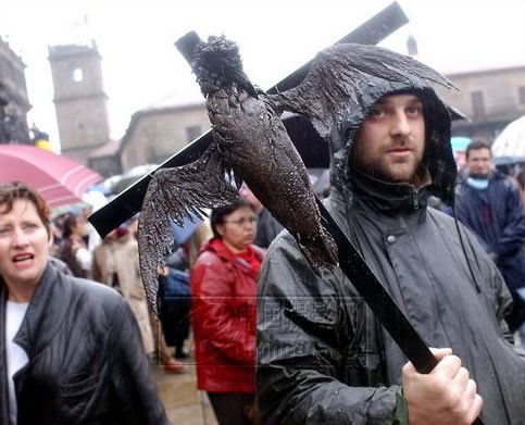 美联社记者X.Ray 拍摄自西班牙北部Santiago de Compostela的一次抗议集会。一位示威者举着一个绑着被石油泄漏致死的鸟的十字架走在游行队列中。注意摄影师在强化主体的同时,注重突出人物脸部(表情),以及净化画面的方法。