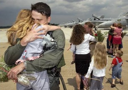 美联社记者 Ateve Helber 2003年3月28日摄自美国维及尼亚州海军基地的一个画面。一个飞行员正在与前来欢迎他的女儿紧紧拥抱。摄影者找到一个十分适当的角度,从而使这一行为得到了非常好的呼应,并且利用背景上的飞机清楚地交待出主人公的身份和环境。相似行为的重复出现,可以非常有效地强化作品的感染力。