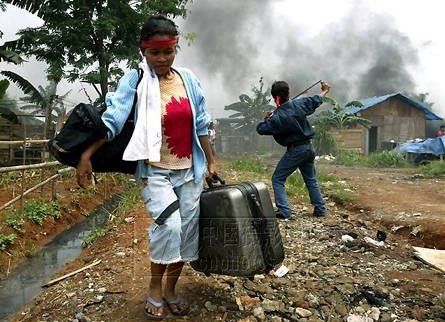 路透社记者Beawiharta 2003年9月17日拍摄自印尼首都雅加达的一幅画面。警察将非法居民驱逐出居住区。主体妇女的服饰、表情、行为和随身的物件非常丰富地交待出了她的身份和目的,陪体男子的行为非常重要地补充了被驱逐的情节,背景的居住区则交待出她们将要离开的地方。那片浓烟不论为何出现(说明也没有交待),但它确实非常好地营造了紧张气氛。注意,在这幅画面中是很难找到我说的“垃圾”的,甚至连构图都显得那样完美无缺。