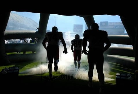 盖蒂图片社记者Gonald Miralle 2002年9月12日拍摄自美国亚利桑娜州全国橄榄球联盟赛现场。亚利桑那深红队(Arizona Cardinals)队员正在入场,对战圣地亚哥冲锋队(San Diego Chargers)。脚下的喷雾器为队员入场营造气氛。摄影者只拍防护棚下借着烟雾冲入场地的少数几个运动员的身影,主题交待得非常清楚,画面中的战前气氛显得十分浓厚。