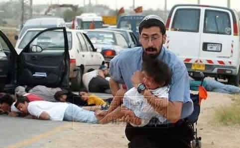 路透社记者Gadi Kabalo 2004年5月9日拍摄自加沙南部最大的犹太人定居点古什卡蒂夫一条街道上的镜头。巴勒斯坦武装组织突然发起袭击,大部分人趴在汽车后面躲避,一个犹太移民抱着孩子冲向安全地带。这位男子生动的行为和表情,正是在这种交待得非常明确的背景衬托下,才体现出非凡的意义。
