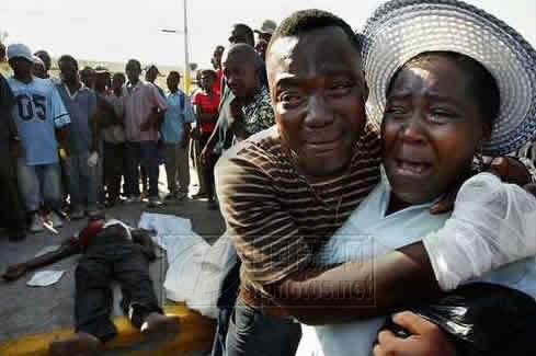 洛杉矶时报记者 Carolyn Cole 2004年3月8日摄自海地太子港。头天晚上在经过一个关卡时,中间这位男子因为没有及时将车停下来,致使他的兄弟Micial Thelusma被值勤的美军当场击毙。正是由于摄影者将有关此事件的核心画面十分突出地拍摄到画面上,才与主人公悲痛的表情紧密结合,清楚地交待出主题。