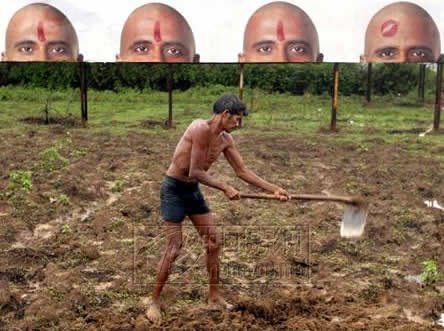 路透社记者Sherwin Crasto 2003年6月16日拍摄自印度GOA一个农田里的画面。连续几天的大雨,终于缓解了印度南部的旱情,这位农民正在抓紧时间耕种。作品的标题叫“准备好新的生长(Ready for new growth)”,背景是一块有关秃头的广告牌。注意最后一个秃头上的红斑变成了一个吻印。这个广告是在宣传什么我说不准,但它与前景中的主人公相互呼应,却使作品产生出某种较强的暗示,从而大大增强了人们对作品的关注。