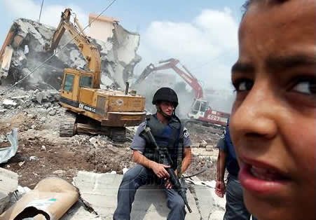 法新社记者 Eitan Hess-Ashkenazi 2003年8月27日拍摄自约旦河西岸一个小镇的画面。以色列士兵正在拆除一个犹太人居住地,一个巴勒斯坦男孩儿正在附近观看。此画面的背景使用有些特殊。
