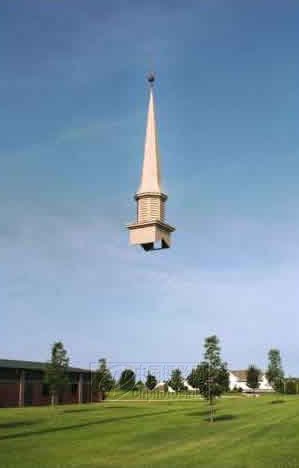 美国哥伦比亚每日论坛记者Ed Pfueller 2004年7月14日摄于美国密苏里州哥伦比亚一座基督教堂的画面。由三个基督教徒捐助的一个25英尺高的铝制教堂塔尖,正在被吊装到教堂的顶上。摄影师有意回避了正常的施工现场,甚至回避了吊车,从而使画面显得莫名其妙,几乎完全无法说明这是怎么回事。这幅作品由于摄影师的奇特拍法而体现出相当的魅力,但对我们来说,也侧面地证明了背景在叙述方面的重要作用。