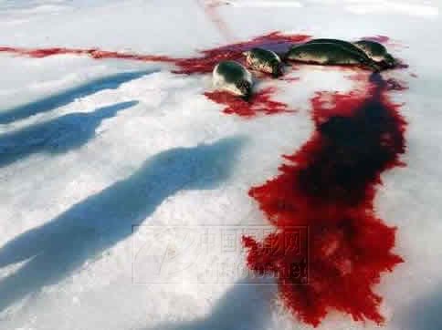 路透社记者鲍尔·戴罗(Paul Darrow)4月1日拍摄自加拿大圣劳伦斯港的画面。一群猎人抗议禁猎,故意射杀几只海豹,一队国际动物保护组织成员(阴影)刚好从这里经过而看到。