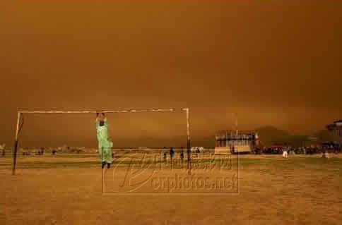 美联社记者托马斯·穆尼特(Tomas Munite)4月6日拍摄于阿富汗首都喀布尔一个公园内。一场友谊赛前,一个守门员吊在球门的横梁上玩耍,一场风暴即将来临。