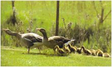 这处家庭景象表现了一窝小鹅在2只大鹅保护下的情景,由于500毫米镜头的景深比较浅,故能把鹅从周围的环境中分离出来。