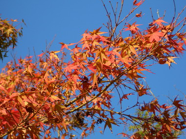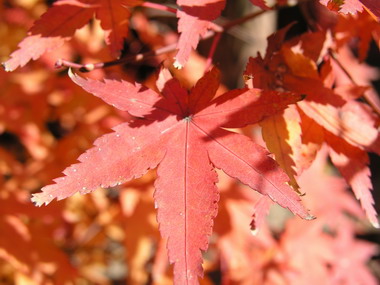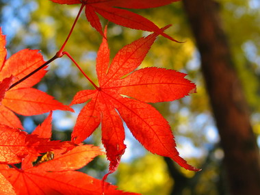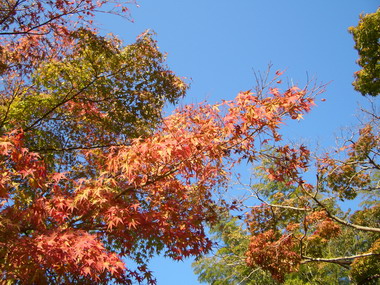 深秋的时候,随处散步的时候偶然看到红叶的话,把它拍下来也很有趣。特地去拍摄红叶的话,一定要先好好调查一下。如果没有调查的话,也可以不用担心何时会看到红叶,只要随身带着数码相机就行。如果去拍摄的时候,红叶的全盛期还没到。这时候枝头既有红叶也有绿叶。这种情况下就可以用长焦来拍摄,让有红叶的树枝占据画面的大部分,给人一种红叶已经很多的感觉。
