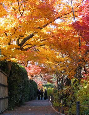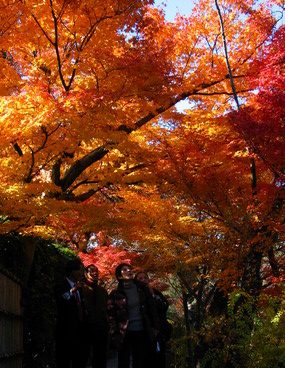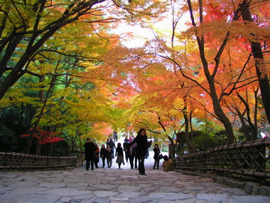 京都龙安寺厨房前的台阶 如果实际去那里的话,景色是很美的,但是只看这张照片的话就很难体会到了。原因有很多,其中一个就是数码相机不是很擅长拍远景。具体来说,数码相机不适合表现明暗反差很大的构图。对于这张照片来说,树叶的空隙透出的天空非常明亮,而红叶影子下的台阶和树阴就非常暗。明暗反差很大。这样的话,就超过了数码相机可以同时记录下来的亮度范围(动态范围),亮处的叶子就好像是溶解在了天空的白色中,颜色显得不那么漂亮了。